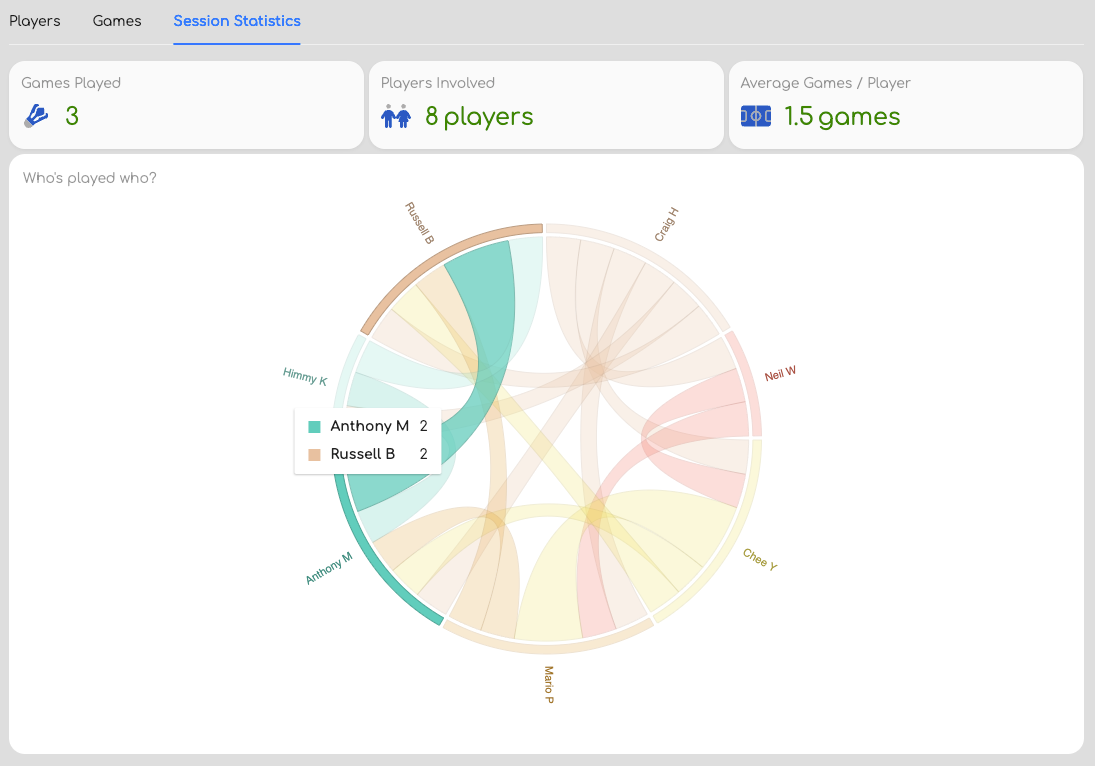 - Chord Graph: Visualise partnerships and matchups with a dynamic chord graph showing who played with whom.