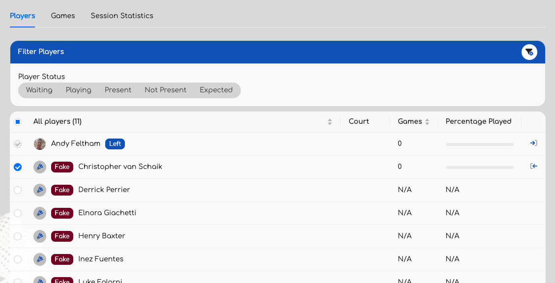 - Mark Attendance: Add them to the session by checking their name. If you accidentally add someone, simply uncheck them to remove them. Checked players will become available for selection in the Games tab.