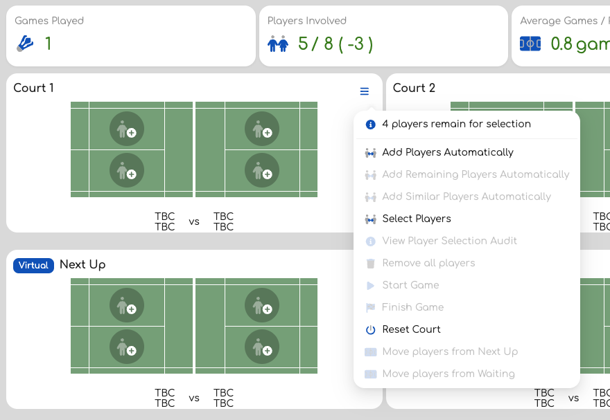 - Auto-Select: Use the court menu to automatically find a compatible group of players who are ready to play, ensuring balanced matchups. You can do this either with an empty court, or you can add a couple of seed players and then ask the system to fill the remaining slots.