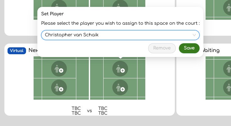 Once a court has four players, you’re ready to start the game! Click on the play icon next to the court to start things going. Any players allocated to a court are not available for selection on any other court.