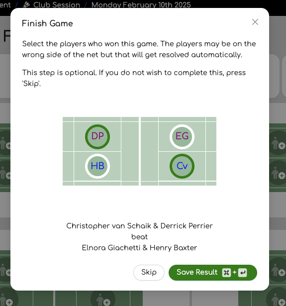 When the game is done, use the Finish option in the court menu or the finish icon. This will release the players so they can participate in other games. A pop up window will appear after the game has finished to allow you to mark who won the game. This is optional.