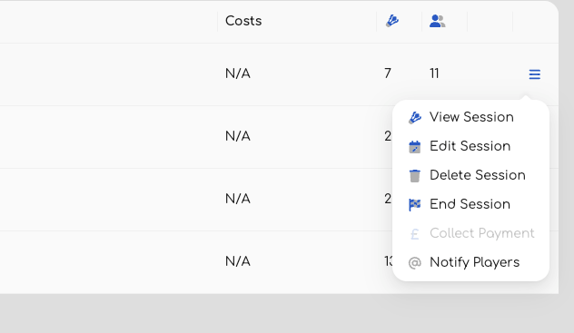 If you are in a session ( left ), or if you are looking at the list of sessions ( right ) then as long as the session hasn't started then you'll find an "Edit Session" option. Clicking on this will take you to a similar process that you used to create the session in the first place, but with the current values already populated. Simply make any changes you need - such as date, time, or the number of courts - and complete the process by saving the session.