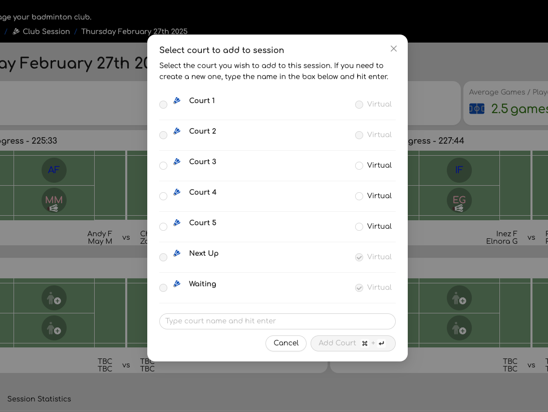 As a reminder, the "Virtual" courts you won't be able to start or finish games on, but can be useful for managing waiting players.