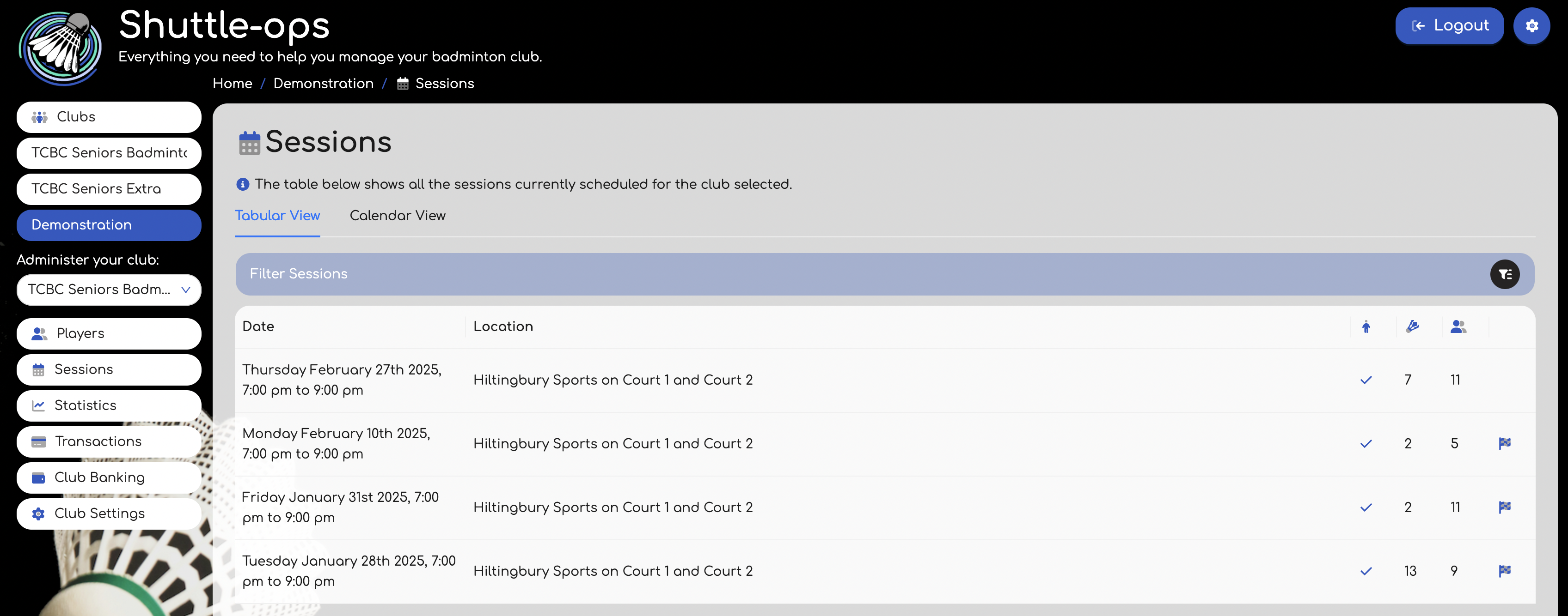 The table indicates the club, location, and the number of games and players there were. If there is a tick icon shown then this means you have attended it. Likewise a finish flag means that its a past session.