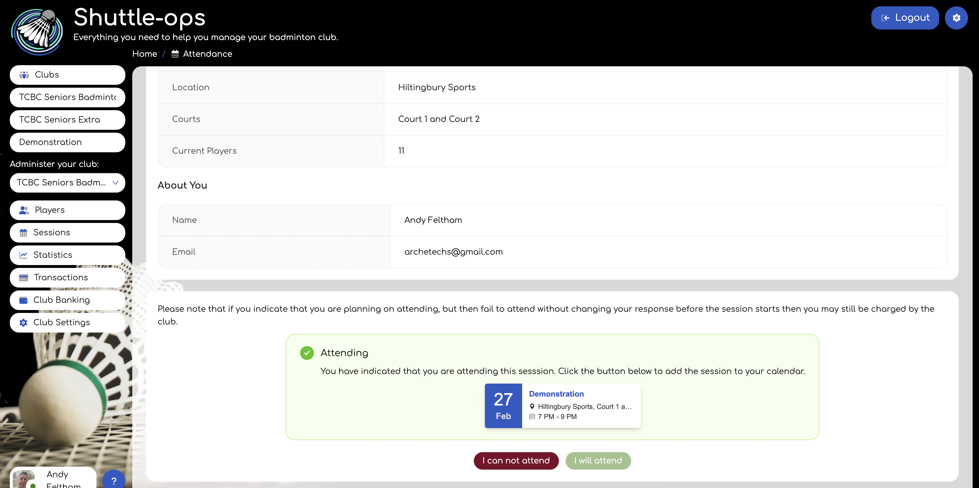 If the session hasn't started, then at the bottom of this summary will be options to indicate if you can or can't make it. This helps with the planning of the session and potentially allows the club to book more courts if needed. There might be a maximum player limit on the session and so at times you won't be able to indicate that you will attend because it is full. Clicking on the calendar entry will allow you to add the session to a calendar of your choice.