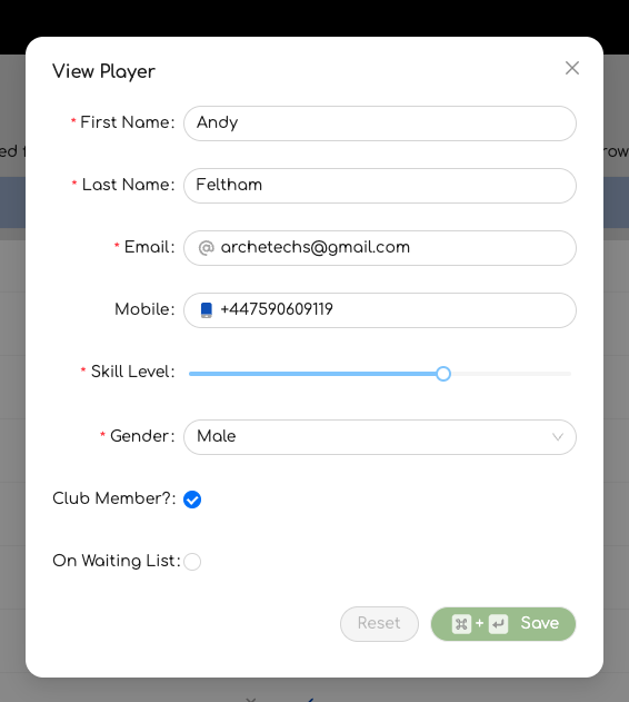 Note that the skill level is an arbitrary value from 1 to 10 that gives an indication of the player skill. This is used when assigning members to a court. Be aware that this value is for the player, not the player at a specific club and so should be set appropriately.