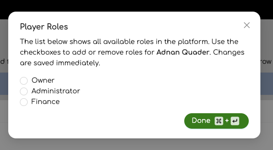 Using the radio buttons you can select or deselect any roles you wish to have for this player. The Owner role will control the club and be able to assign roles to users. They will also receive the notifications when players wish to join your club. The Administrator role will be able to create sessions and manage the games within that session while the Finance role is able to look at money owed to the club by players. Note that the owner is the combination of the administrator and finance roles.