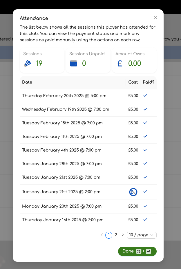 When you do this, a new window will pop up allowing you to see all the sessions this player has attended. As shown below, this will also indicate the cost for the session if one has been set, and an indication if the player has paid this session cost. The statistics at the top will give you a quick overview of how much that player owes.