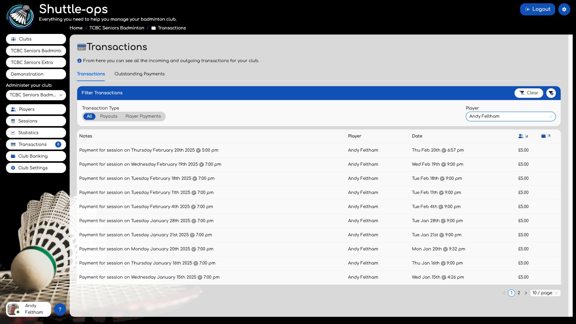 Items on the "Transactions" tab are automatic payments as a result of them entering their bank account details via their profile page. Once authorised, ShuttleOps will take the payment for the session automatically based on the settings of the club. Alternatively the "Outstanding Payments" tab will list all sessions a player has attended but where a payment has not been made automatically. This could be due to an error completing a transaction or the player not adding their payment details. If the player has paid you via other bank transfer or cash then you can use the tick icon to mark the payment as received. This will update their attendance view shown above.
