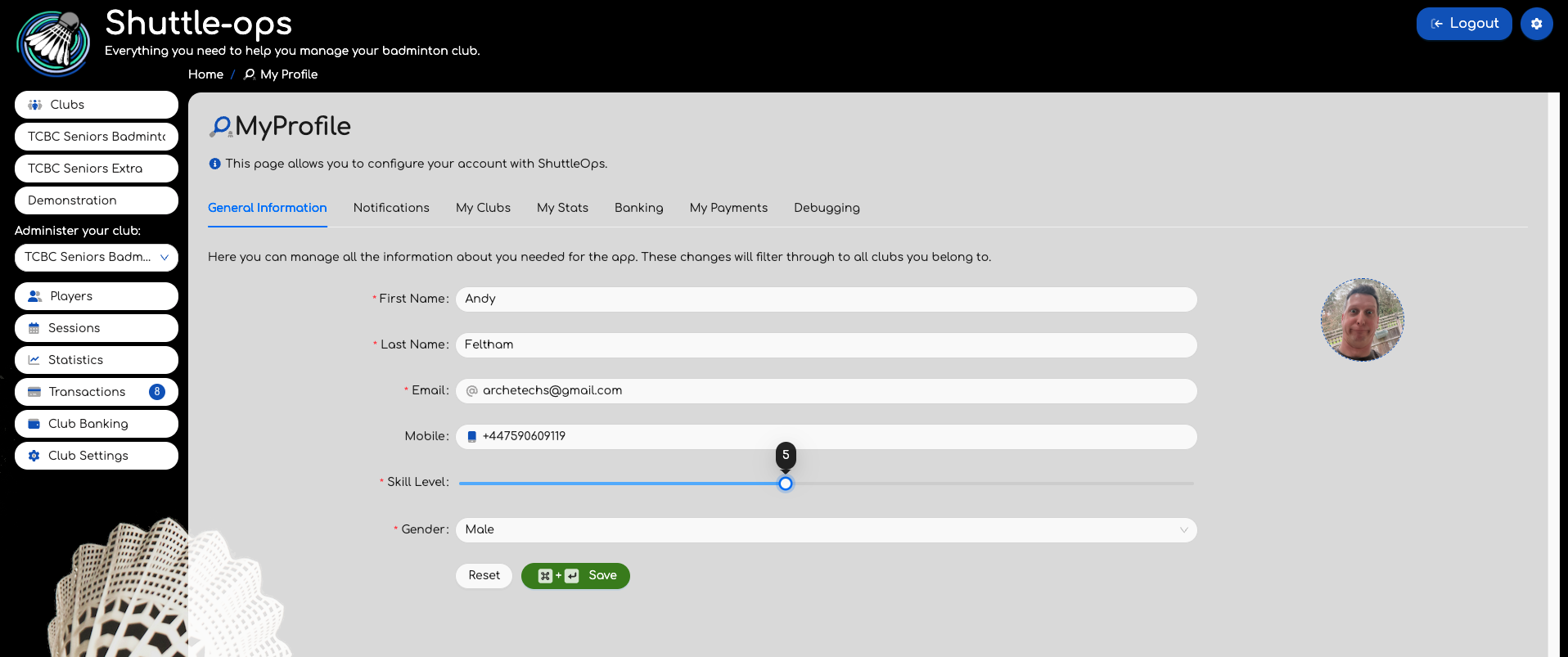 This skill level is a number between 1 and 10 and is a notional indication of your ability on court. ShuttleOps uses this value if a session administrator selects to find players of a similar ability for a game.
