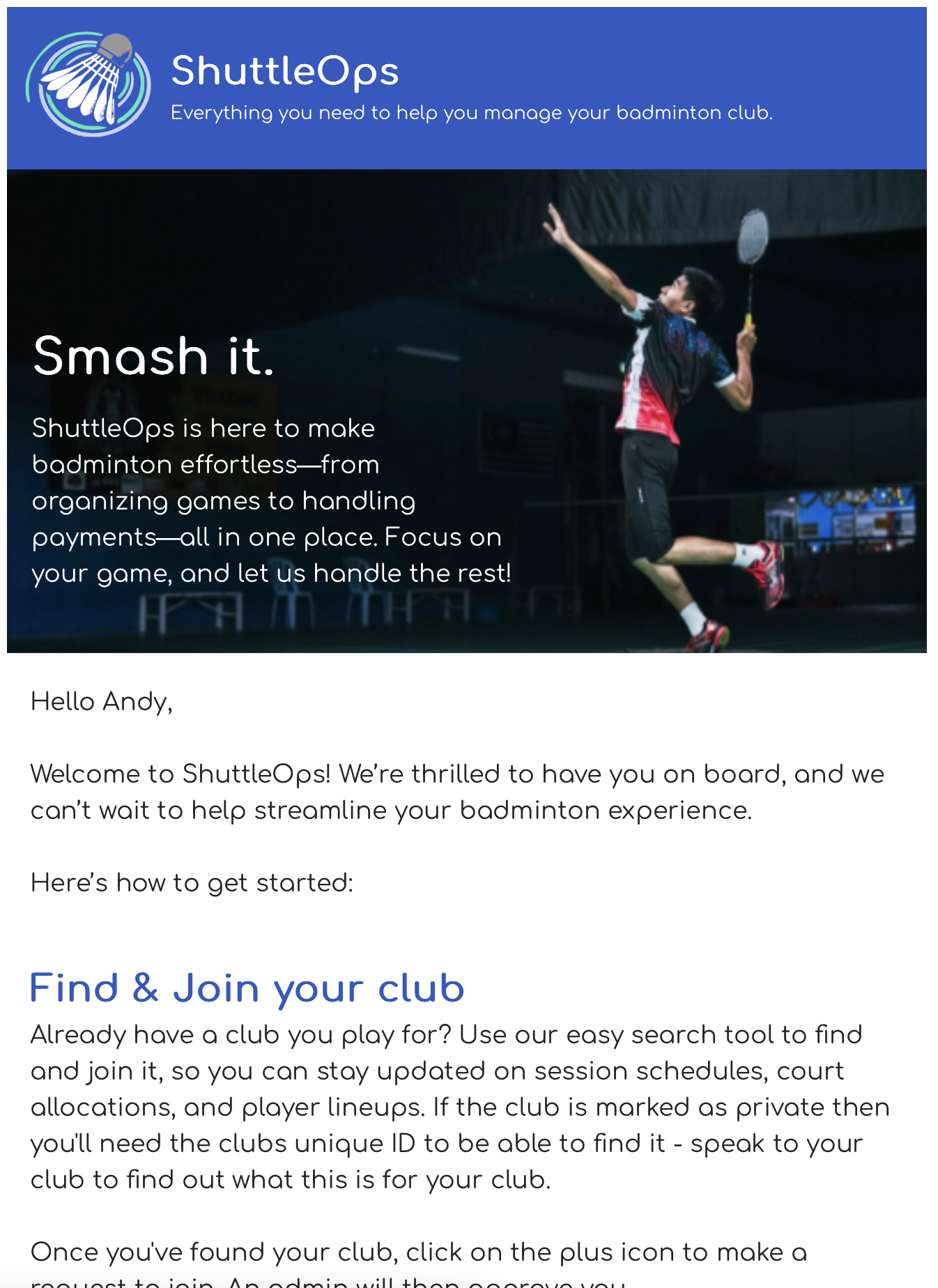 Following successfully registering with the platform the player will get a welcome email. To help ensure familiarity with the process, an example of the welcome email is shown below.